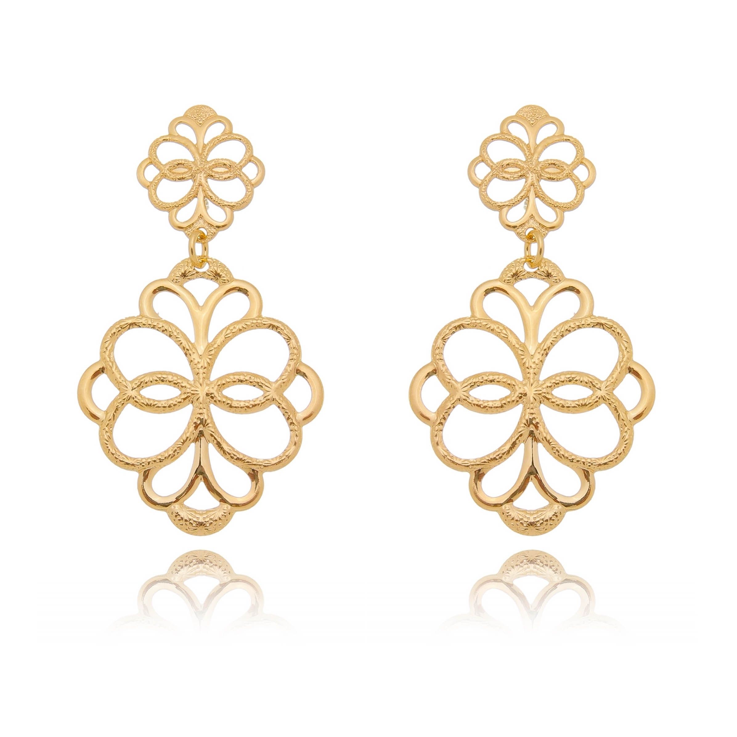 Brinco floral trabalhado pendurado folheado ouro 18k