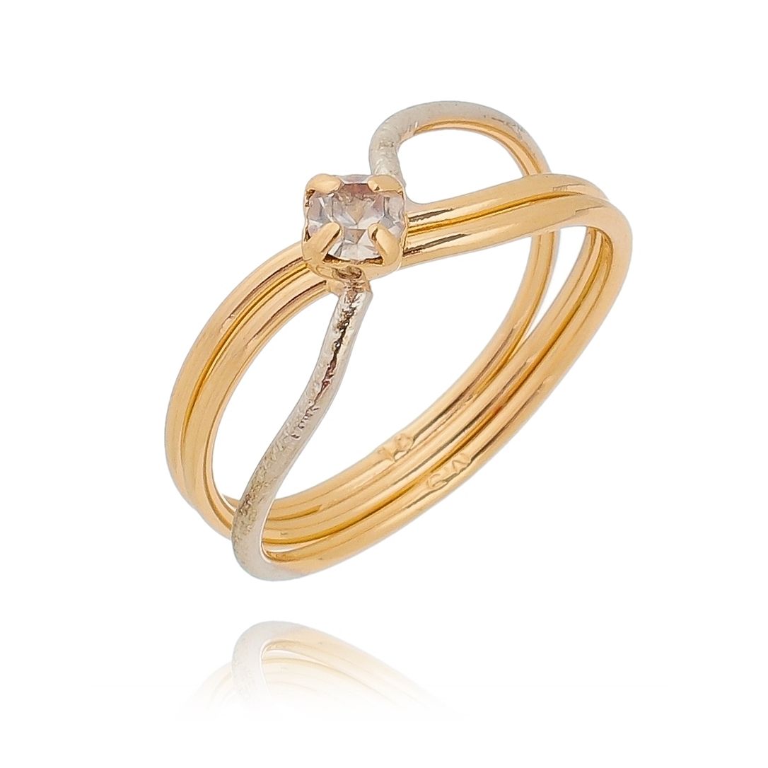 Anel solitário de três aros com pedra de strass folheado a ouro 18k.