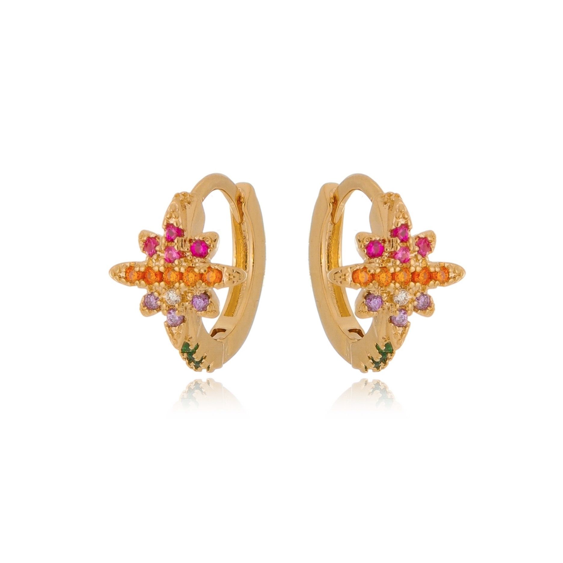 Argola folheada a ouro 18k com estrela e pedras coloridas.