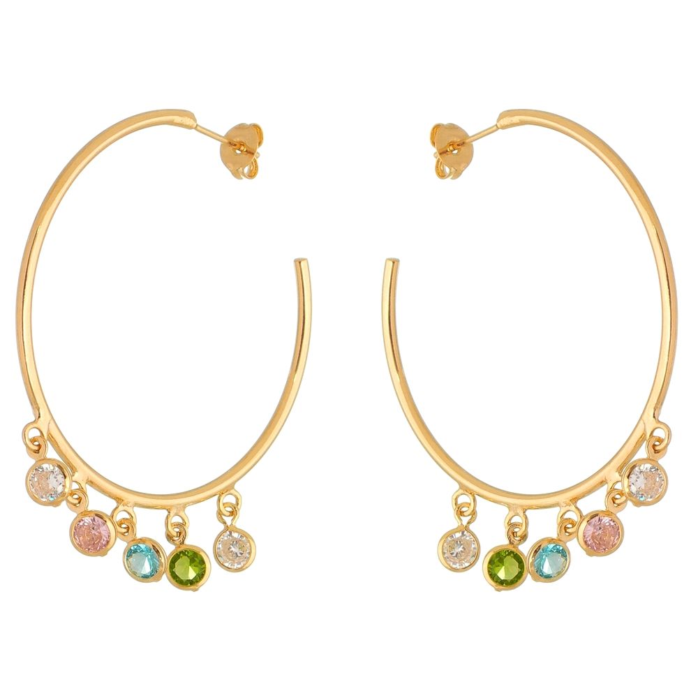 Argola folheada a ouro 18k com zircônias coloridas penduradas.