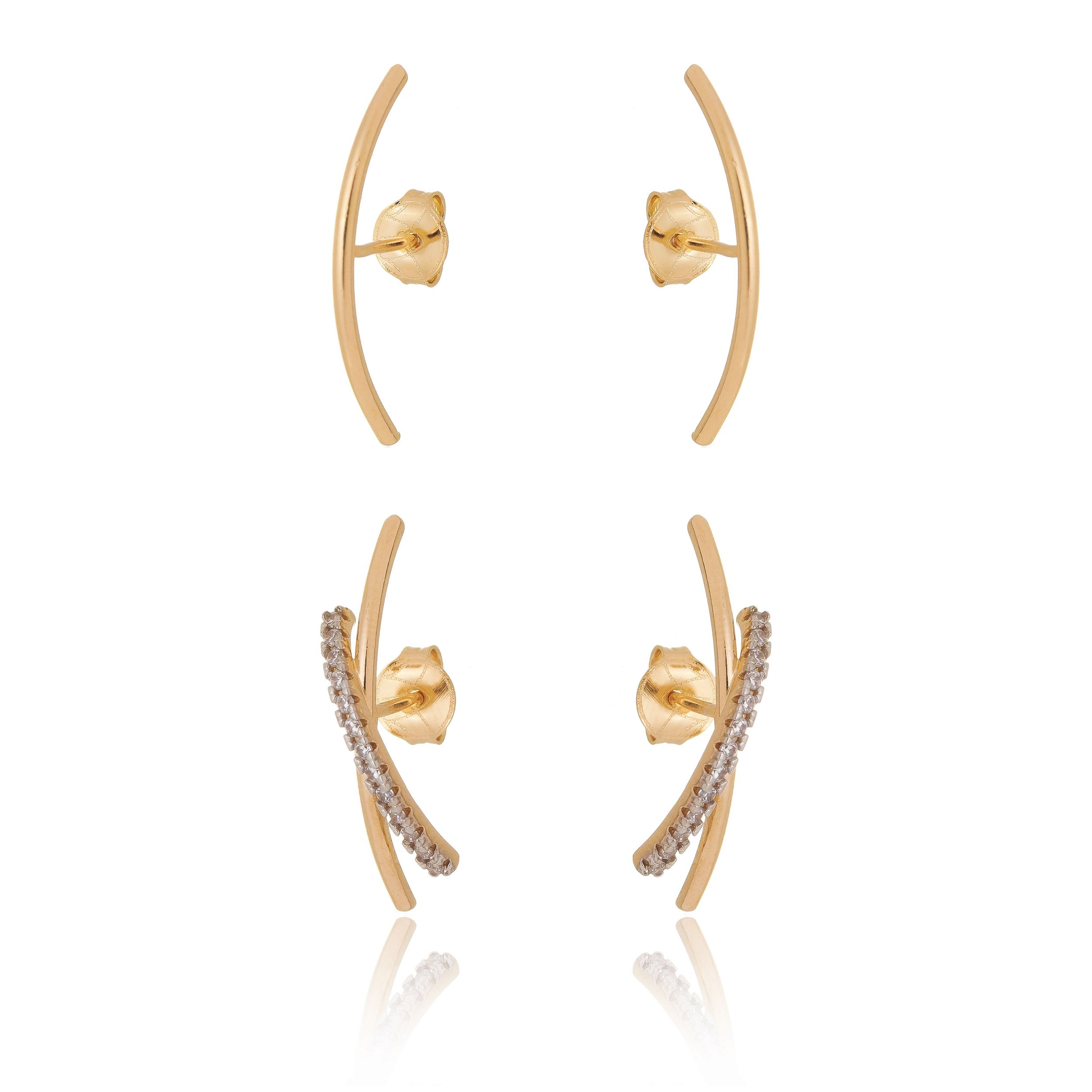 Brinco duplo folheado a ouro 18k um liso e um cruzado com zircônias.