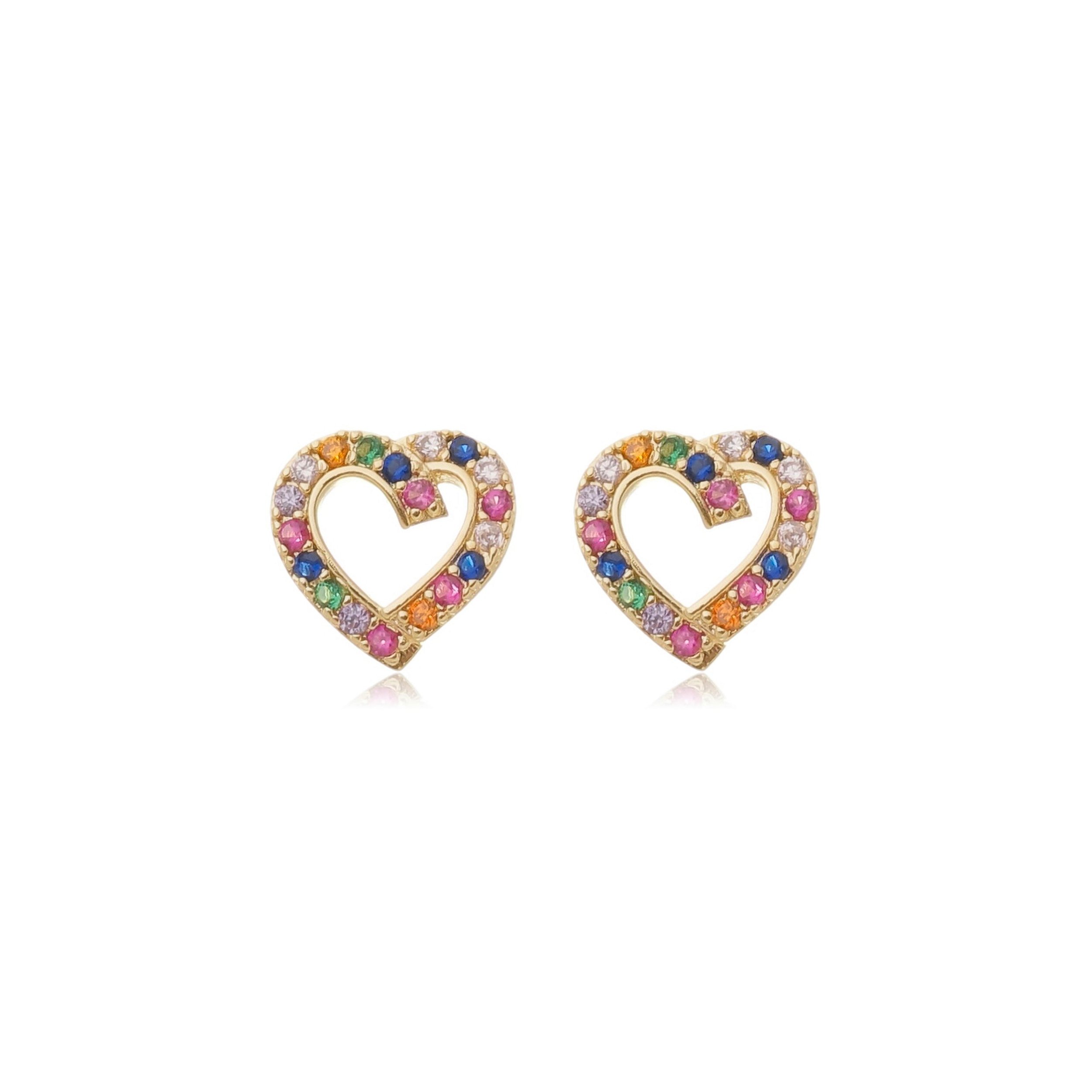 Brinco fita em forma de coração cravejada com zircônias coloridas folheadas ouro 18k