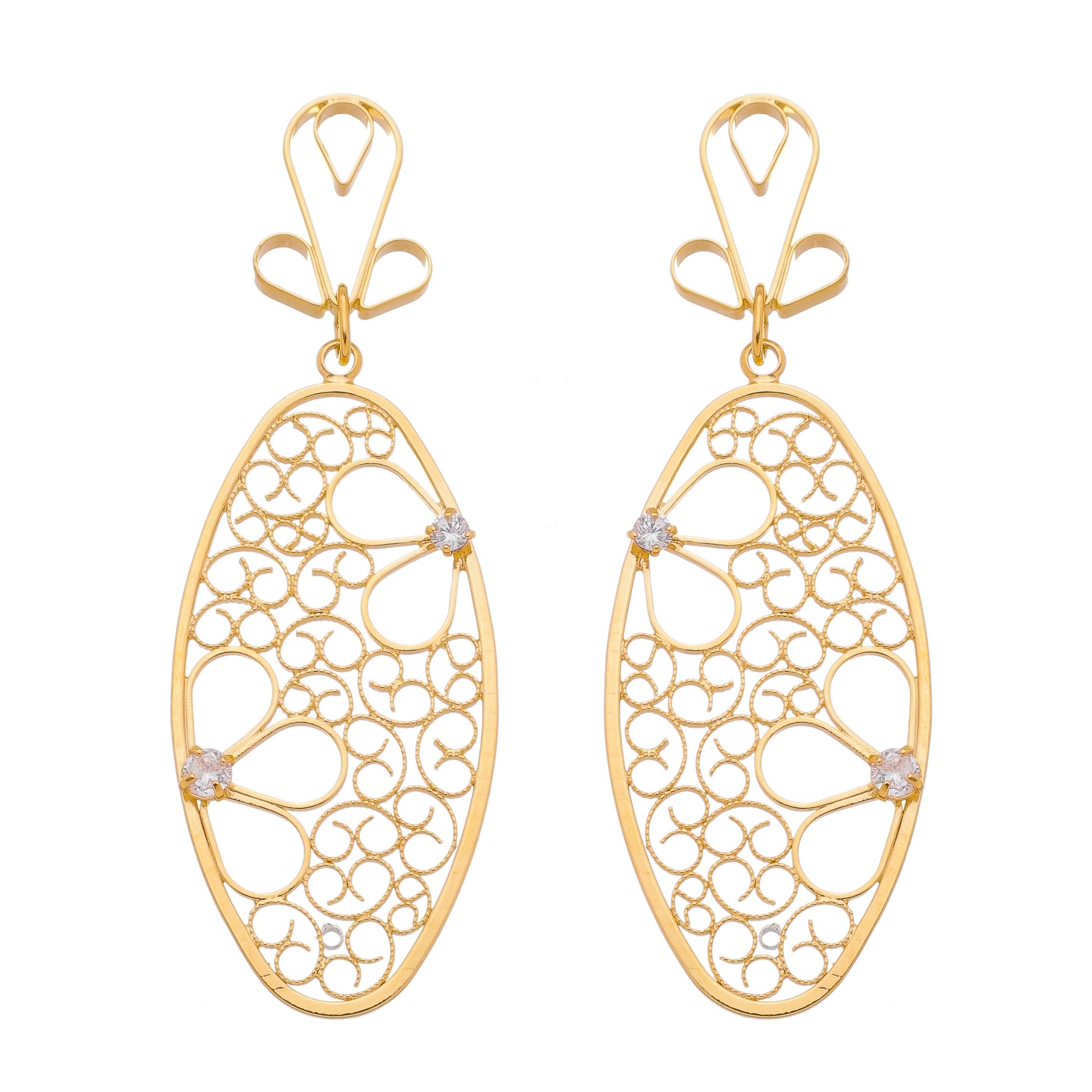 Brinco oval trabalhado folheado a ouro 18k com zircônias.