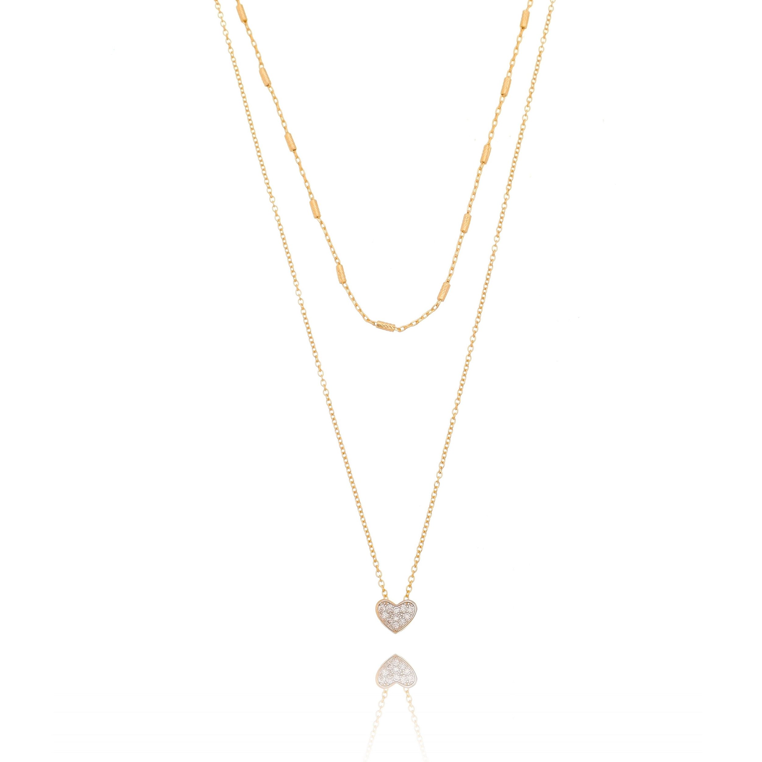 Gargantilha folheada a ouro 18k com correntes grumet lisa e trabalhada e coração com zircônias pendurado.