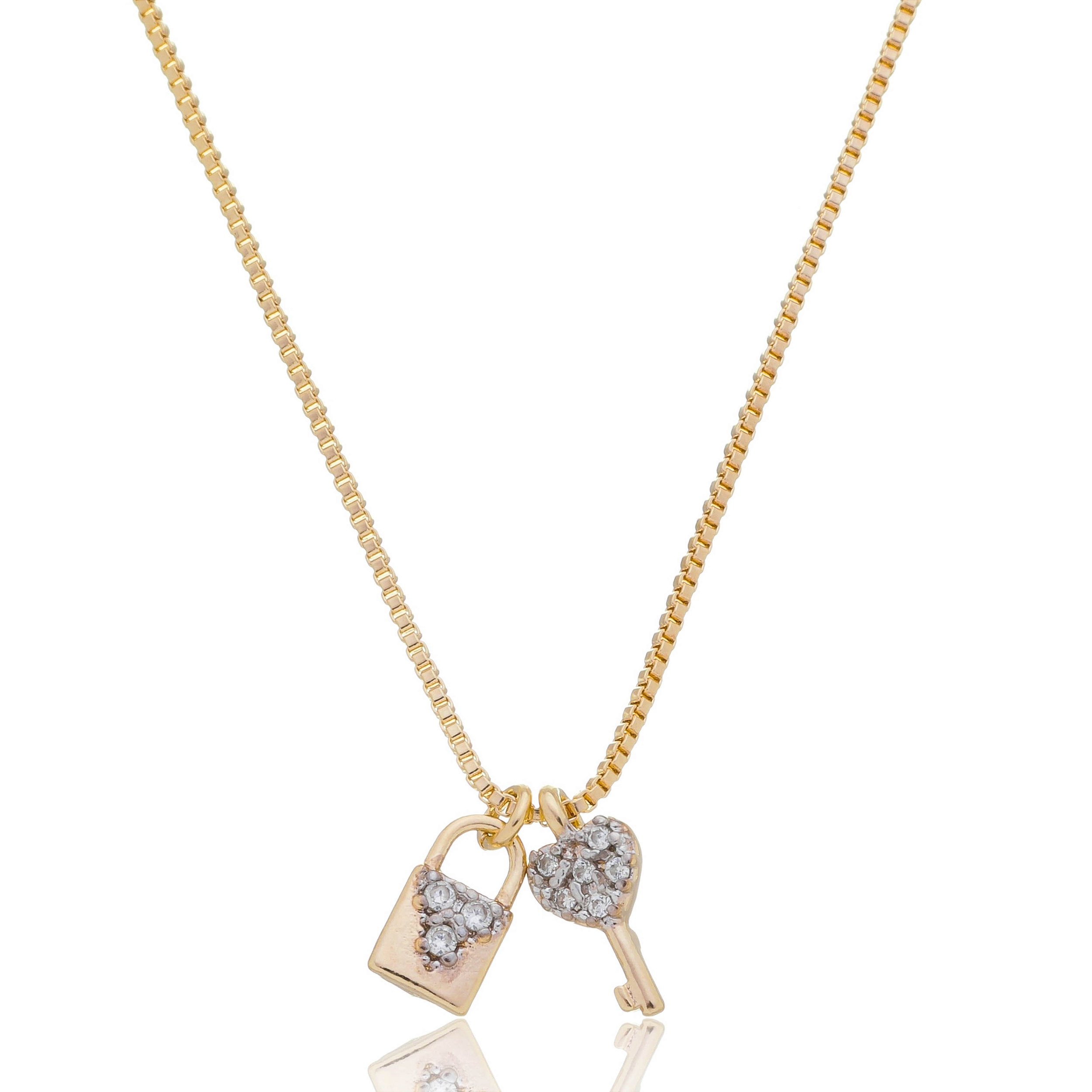 GARGANTILHA FOLHEADA A OURO 18K COM CADEADO E CHAVE COM ZIRCÔNIAS