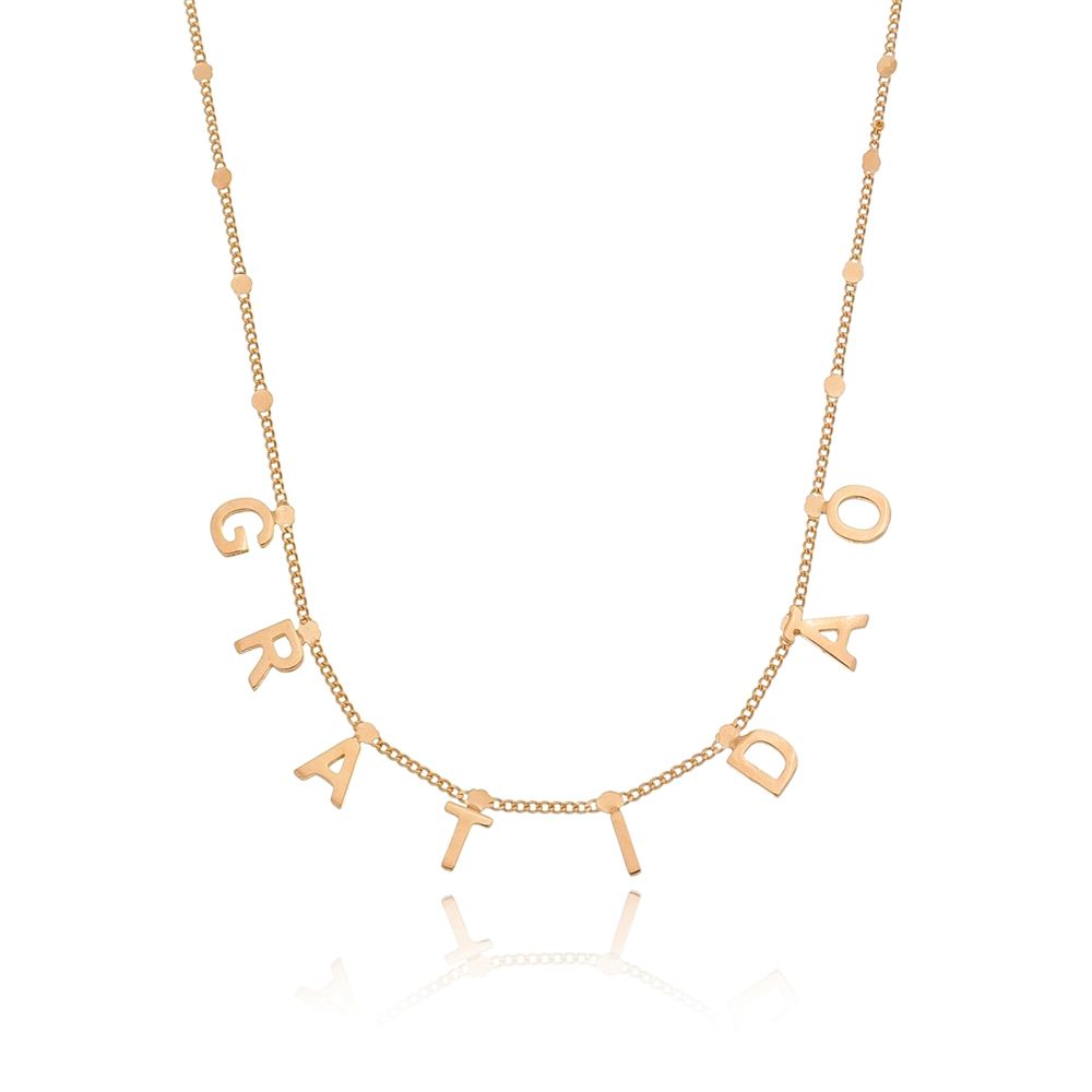 Gargantilha folheada a ouro 18k com a palavra 'GRATIDÃO' pendurada.