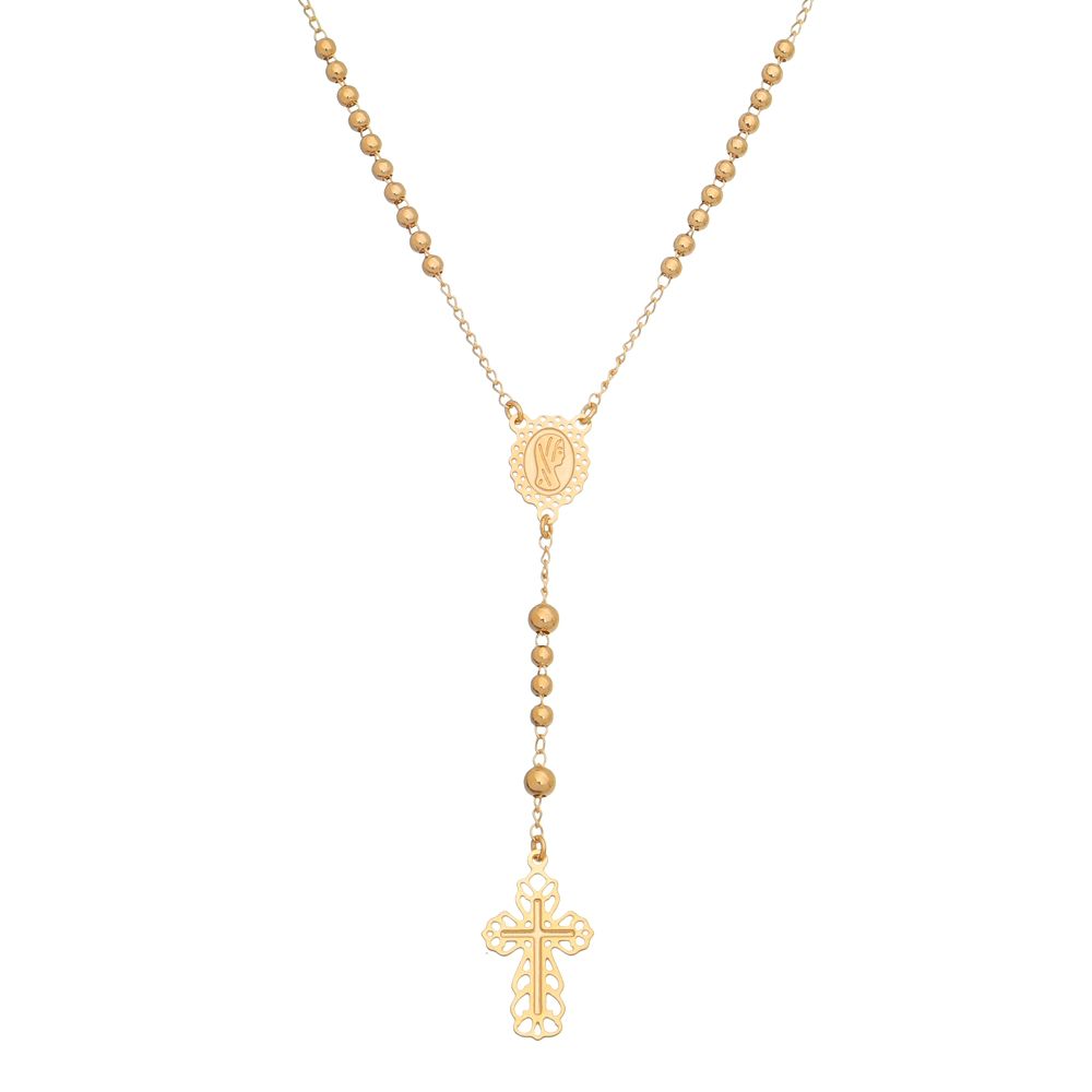 Gargantilha terço com cruz trabalhada folheada a ouro 18k.