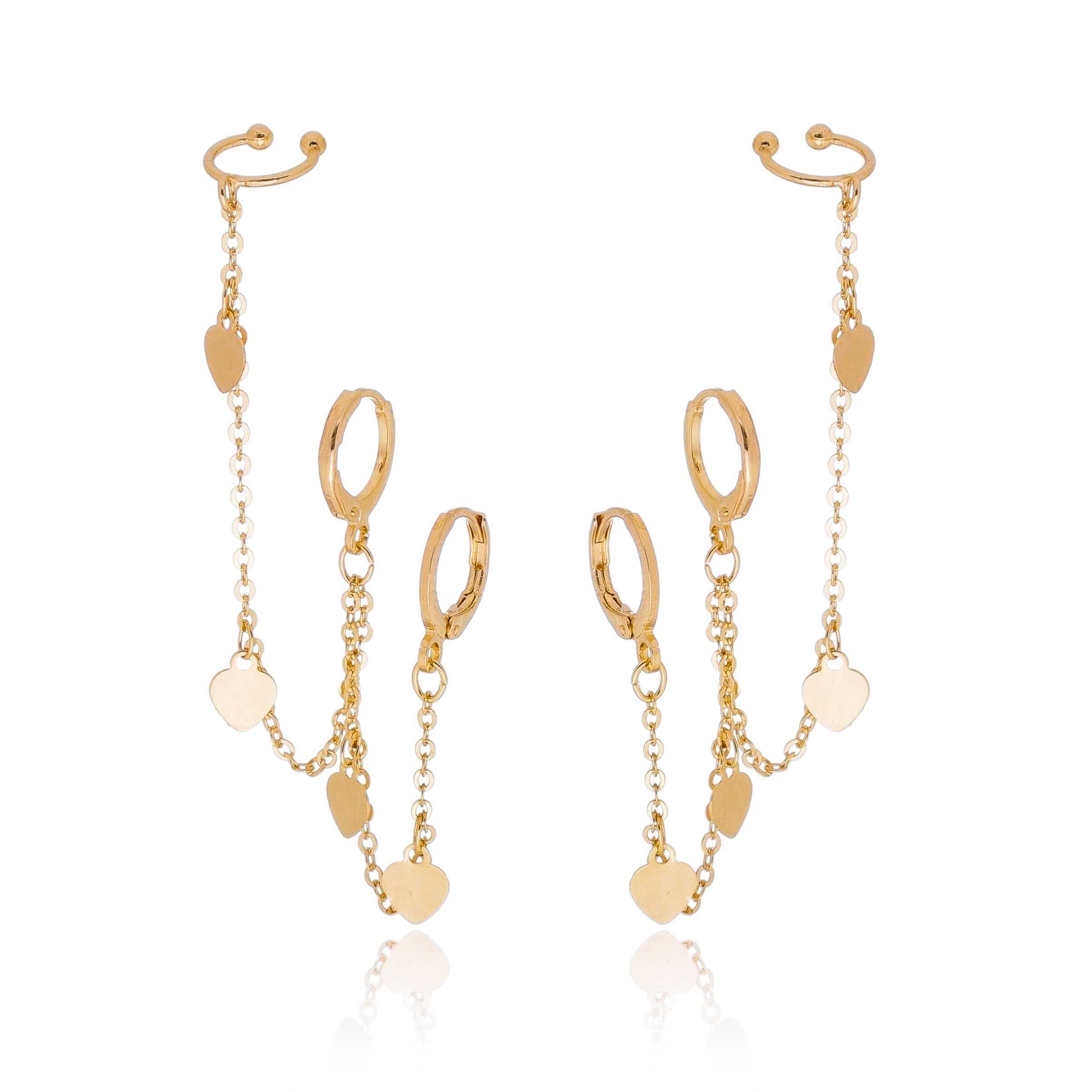 Brinco Duplo Terceiro Furo Falso Coração Folheado a Ouro 18k