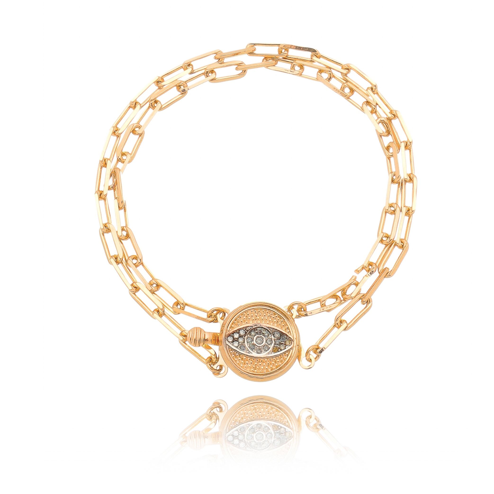 Pulseira de olho grego com duas correntes folheado a ouro 18k.