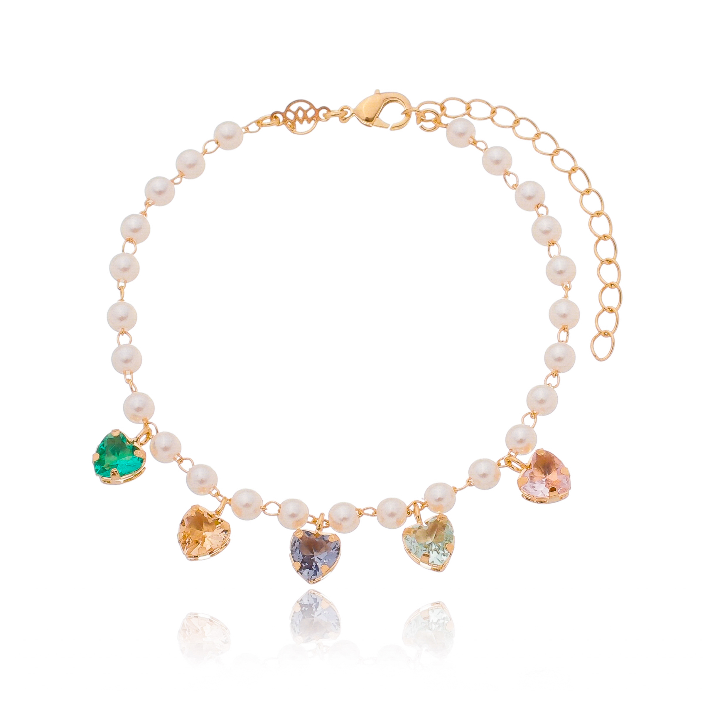 PULSEIRA PÉROLA COM CORAÇÕES COLORIDOS FOLHEADA A OURO 18K 19cm
