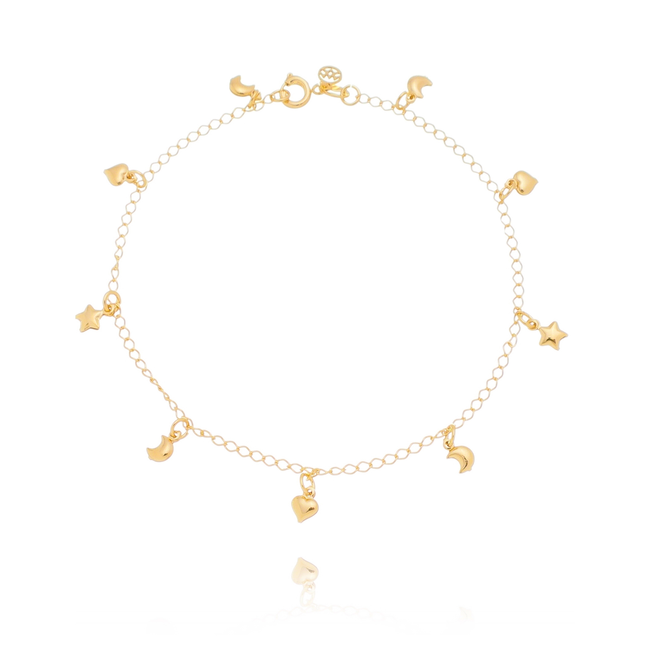 TORNOZELEIRA FOLHEADA A OURO 18K LUA, CORAÇÃO E ESTRELA 24cm