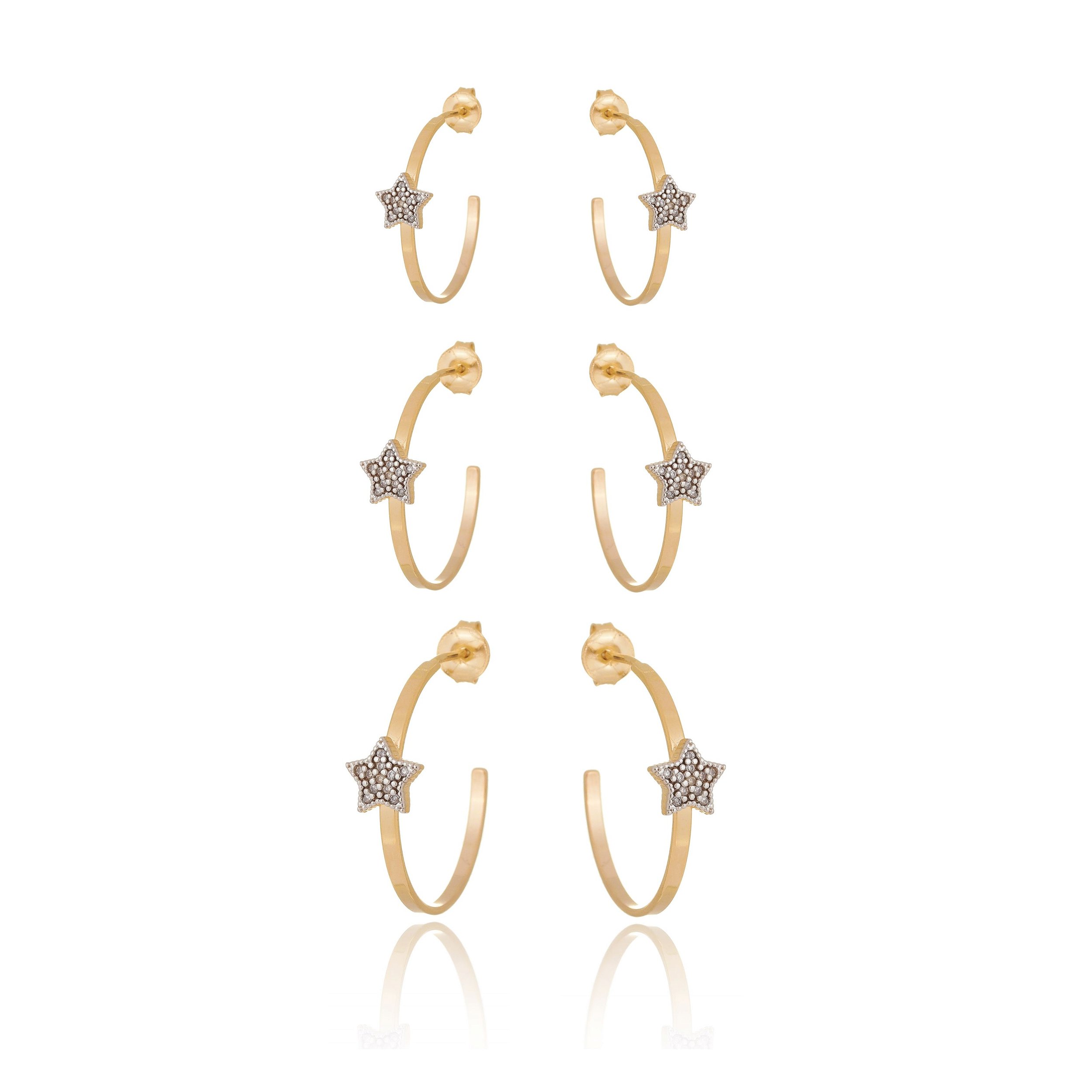 Trio de argolas folheadas a ouro 18k com estrelas cravejadas de zircônias e ródio.